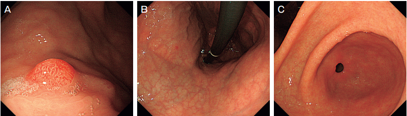 Figure 3. Endoscopic images of Case 2 at the age of 38 years. A reddish hyperplastic polyp was observed in the gastric corpus (A). Although atrophy of the gastric mucosa was not initially noticed, re-evaluation of the endoscopic images revealed fornix- and corpus dominant atrophy (B) and less involvement of the antrum (C).
