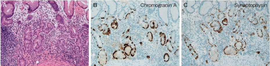 * Pathological evaluation: chromogranin A staining (endocrine cell hyperplasia forming linear clusters and micro-nests)