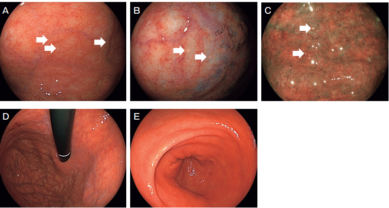 Figure 2. Endoscopic images of Case 1 at the age of 69 years. Scattered minute whitish protrusions were observed in the gastric fundus (A-C, arrows; A, white light image; B, linked color imaging after indigo carmine dye spraying; C, blue laser imaging). There was corpus-predominant atrophy (D), while the antrum was less affected (E).