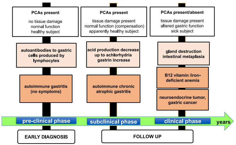 최근 Miceli et al.[73]은 단일 기관에서 수행된 18년간의 전향적 연구 결과를 발표하였다. 연구진은 A-CAG 환자 498명을 잠재적(n=96), 초기(n=63), 진행(n=64), 심한(n=263), 그리고 합병증 동반(n=12, 신경내분비 세포 이형성, 제1형 신경내분비 종양, 저등급/고등급 비내분비 이형성/샘상피내종양, 선암종 포함) 단계로 분류하였다. 연구 결과, PCA는 존재할 경우 A-CAG의 잠재적 단계의 지표로 유용할 수 있으며, 많은 경우 시간이 지나면서 A-CAG로 진행하는 비율이 높았다(10.8/100인·연). 그러나 PCA 역가는 질병 단계와 관계없이 변동하는 경향을 보였으며, 혈청 G17이 A-CAG의 잠재적 단계에서 진행성 단계로 이행하는 데 있어 보다 신뢰할 수 있는 마커로 작용하였다. 연구진은 A-CAG가 장기적으로 꾸준히 진행하는 질병이며, 위축의 회복은 관찰되지 않았다고 확인하였다.