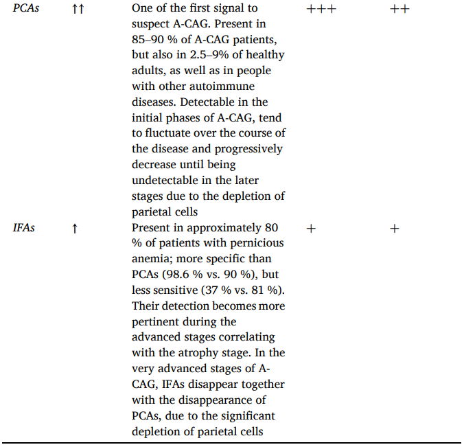 PCAs 및 IFAs는 A-CAG의 위축성 손상을 감지할 수 있는 면역학적 마커로 제안되었으며, 이는 비침습적인 방법으로 내시경 이전에 A-CAG를 평가하는 데 유용할 수 있습니다 [53,67].