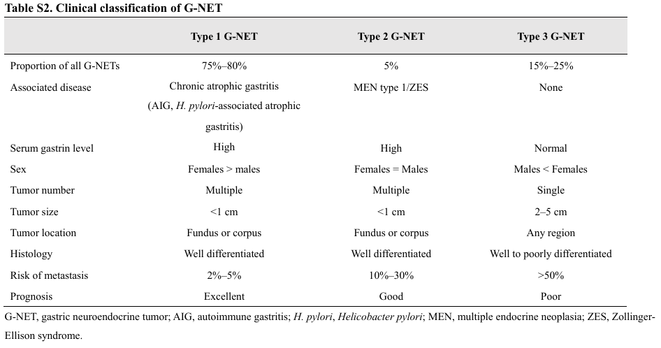 Rindi 등[21, 22]은 G-NETs를 서로 다른 임상적 배경을 가진 세 가지 아형으로 구분하였다. 제1형 G-NETs(유병률 약 75%–80%)는 만성 위축성 위염과 관련되고, 제2형 G-NETs(유병률 5%)는 MEN type 1과 졸링거–엘리슨 증후군(ZES)과 관련된다. 제3형 G-NETs(유병률 15%–25%)는 특정 기저 질환과 연관되지 않은 산발성 병변이다(Table S2).