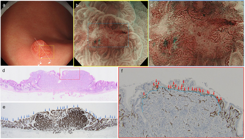 FIGURE 3. Characteristic endoscopic findings of a reddish polypoid lesion. (a) White-light imaging shows a reddish superficial elevated le sion with a central depression on the posterior wall in the middle third of the stomach. (b) Magnifying narrow-band imaging reveals an absent microsurface (MS) pattern plus an irregular microvascular (MV) pattern in the depressed area, which is surrounded by an enlarged groove-type mucosal structure (yellow box in Figure 3a). (c) Enlarged magnifying narrow-band imaging of the depressed area in the blue box in Figure 3b. The brownish irregular microvessels consist of closed (connected) looped vessels. (d) Histological examination of the endoscopic submucosal dissection specimen with hematoxylin and eosin staining along the cut surface of the white line in Figure 3a. The neuroendocrine tumor (NET) is composed of small uniform cells in nests predominantly located in the mucosa immediately below the thinned surface epithelium (magnification ×20). (e) Immunohistochemical examination for cytokeratin AE1/AE3 confirms that the non- neoplastic surface epithelium remains thin above the NET. The presence of the intramucosal NET component has caused the non-neoplastic gland ducts to become sparse and shallow, resulting in the extended intervening parts between the gastric pits (indicated by blue arrows) compared with the surrounding mucosa (magnification ×20). (f) Immunohistochemical examination for CD31 in the area in the red box in Figure 3d reveals dense, dilated subepithelial capillaries (red arrows) in close contact on the tumor surface (light blue dashed line), flattening the surface epithelium and thinning the superficial layer of the lamina propria (magnification ×100). These findings indicate that the NET component, located quite close to the surface epithelium, histologically corresponds to an absent MS pattern plus an irregular MV pattern on magnifying narrow-band imaging.