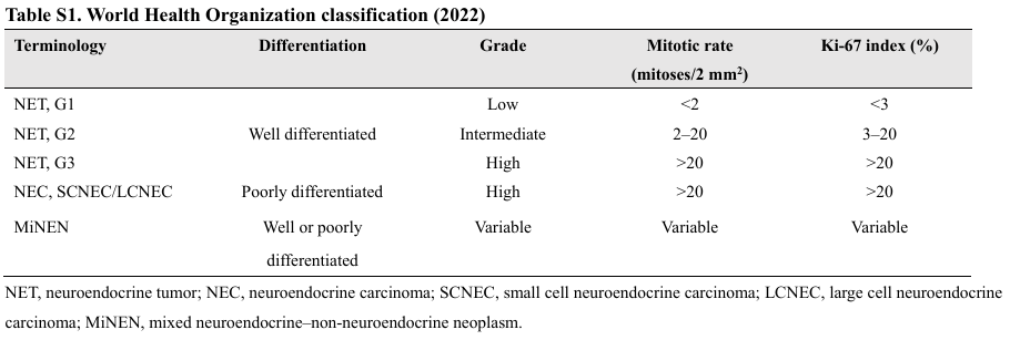 WHO 분류[4]에 따르면, 잘 분화된 NETs는 증식 특성(유사분열률과 Ki-67 지수 모두 고려)에 따라 저등급(G1), 중등급(G2), 고등급(G3)의 세 단계로 구분된다(Table S1).