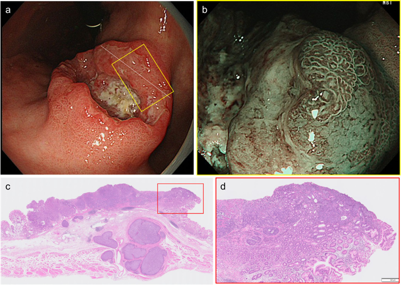FIGURE 7. Advanced-stage (pSS) gastric neuroendocrine carcinoma. (a) White-light imaging shows a 50-mm ulcerative lesion with a distinct border and submucosal tumor-like marginal elevation on the lesser curvature in the lower third of the stomach. (b) Magnifying narrow-band imaging reveals absent microsurface (MS) plus disrupted irregular microvascular (MV) in the slightly depressed area on the inner border of the marginal swelling (yellow box in a). (c) Histological examination of the surgical specimen with hematoxylin and eosin staining along the cut surface of the white line (magnification ×20). (d) Histological examination of the area in the red box in Figure 7c reveals cancer cells showing trabecular architecture and solid cancer cell nests (magnification ×40), indicating that the neuroendocrine carcinoma component was pathologically confirmed to correspond to absent MS plus disrupted irregular MV. The final diagnosis was gastric neuroendocrine carcinoma, 40 × 35 mm, pT3 (SS), Ly2, V3, UL0, pPM0, pDM0, pN2.