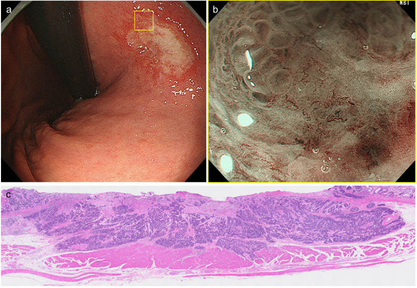 FIGURE 6. Advanced-stage (pMP) gastric neuroendocrine carcinoma. (a) White-light imaging shows a 25-mm reddish superficial excavated lesion with a distinct border, mostly covered with an adherent white coat, on the lesser curvature in the upper third of the stomach. (b) Magnifying narrow-band imaging reveals absent microsurface plus disrupted irregular microvascular in the area with less white coat (yellow box in a). (c) Histological examination of the surgical specimen with hematoxylin and eosin staining reveals cancer cells showing trabecular architecture and solid cancer cell nests (magnification ×40). The final diagnosis was gastric neuroendocrine carcinoma, 15 × 20 mm, pT2 (MP), Ly2, V1, UL0, pPM0, pDM0, pN1