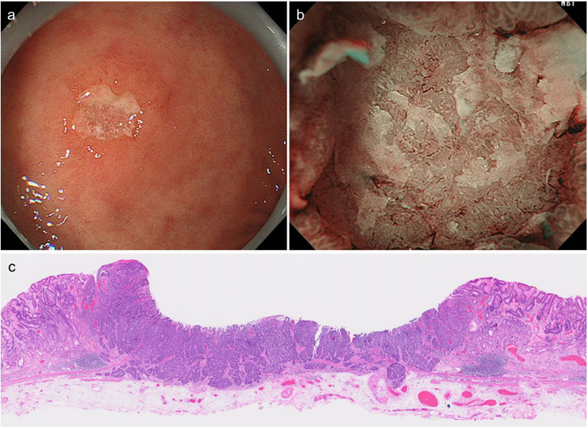 FIGURE 4. Early stage (pT1b1) gastric neuroendocrine carcinoma. (a) White-light imaging shows an 8-mm superficial depressed lesion, partly covered with an adherent white coat, on the lesser curvature of the gastric antrum. (b) Magnifying narrow-band imaging reveals an absent microsurface pattern plus disrupted irregular microvascularization within the depressed area. (c) Histological examination of the endoscopic submucosal dissection specimen with hematoxylin and eosin staining reveals cancer cells showing solid cancer cell nests (magnification ×40). The final diagnosis was gastric neuroendocrine carcinoma, 8 × 6 mm, pT1b1 (SM1, 300 μm), UL0, Ly1, V0, pHM0, pVM0.