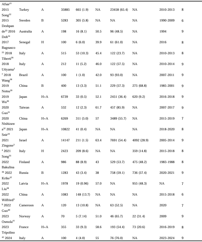 이번 메타분석에는 총 15,817명의 대상자가 포함되었으며, 연구 표본 수는 최소 70명에서 최대 41,245명까지 다양하였다. 연구는 아시아, 유럽, 북미·남미, 아프리카, 오세아니아 등 28개국 또는 지역에서 수행되었다. 참가자의 평균 연령은 27세에서 69세까지 분포하였고, 여성 비율은 7.0%에서 100.0%까지 다양하였다. 포함된 연구 중 23편(23/47, 48.9%)에서는 연구 집단의 H. pylori 감염률을 보고하였으며, 그 범위는 9.1%에서 81.0%까지였다. AIG 진단에는 29편에서 혈청학적 검사가 사용되었고, 이 중 24편은 PCA 검출에 의존하였으며, 나머지 5편은 PGI 및/또는 PGI/II 비율을 활용하였다. 조직학적 방법은 12편에서 적용되었으며, 6편에서는 혈청학적 검사와 조직학적 검사를 병합하여 AIG 진단을 시행하였다.