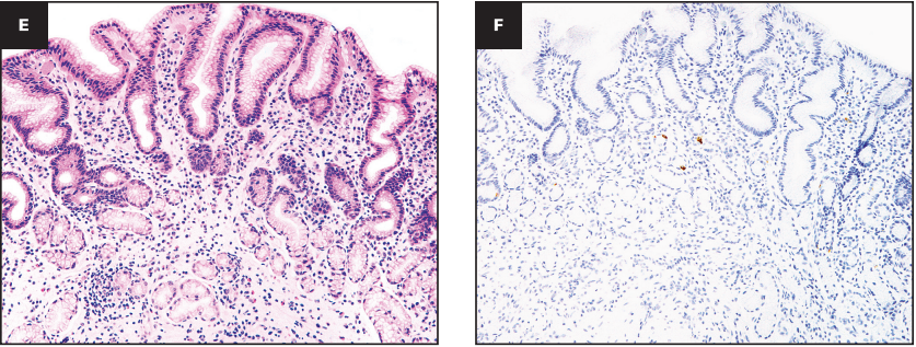 모든 사례는 정의상 위산 분비선(oxyntic gland)의 손실이 일부라도 있었으며, 평균 손실률은 96%였다. 166건(90%)에서는 조직 샘플 내에서 완전 손실이 관찰되었고(그림 1G), 10건(5%)에서는 손실률이 50% 이하였다(그림 1H).