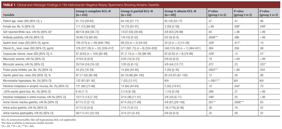 Methods: We reviewed clinicopathologic findings in 184 cases from 184 patients with histologic AG and no evidence of Helicobacter infection. Using neuroendocrine IHC markers, cases were divided into 3 groups: Group 1 showed complete ECL-H (both qualitative and quantitative criteria met), group 2 showed focal ECL-H (qualitative but not quantitative criteria met), and group 3 showed no ECL-H (neither criteria met).