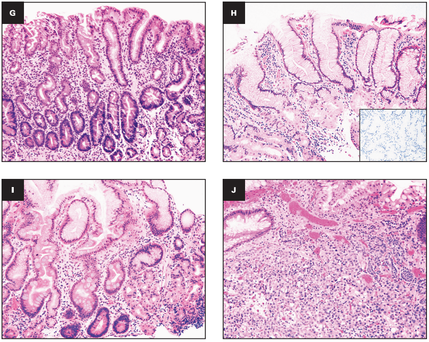 FIGURE 1 (cont) G, Many cases of AG showed complete loss of oxyntic glands (100× magnification). H, Some cases showed only partial loss of oxyntic glands. Inset demonstrates lack of gastrin staining by immunohistochemistry (100× magnification). I, Intestinal metaplasia was a common finding in AG, especially in cases with both quantitative and qualitative ECL-H (100× magnification). J, A few patients with atrophic gastritis showing quantitative and qualitative ECL-H developed gastric well-differentiated neuroendocrine tumors; patients in other groups did not (100× magnification).