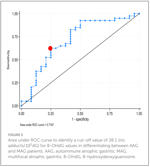 또한, AAG 환자 중 H. pylori 감염 병력이 있는 환자는 순수 자가면역성 위염 환자보다 8-OHdG 수치가 유의하게 높아, H. pylori 감염이 유전자 손상 축적에 기여함을 보여준다. ROC 곡선 분석에서도 8-OHdG 수치 28.1(결합체/10⁵ dG)을 기준으로 AAG와 MAG 환자를 구분할 수 있었으며, 전체 정확도는 77%, 특이도는 95%로 매우 높았다. 8-OHdG 수치가 기준치 이하인 경우 MAG의 오즈비는 8%였다.