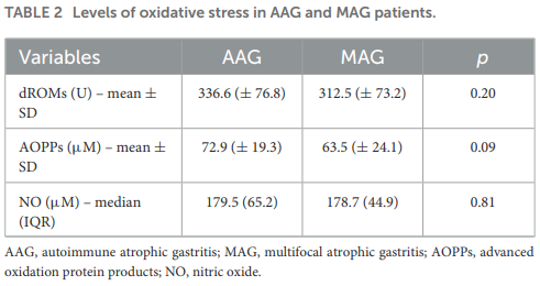 Materials and methods: In this study, 120 consecutive patients with atrophic gastritis (70 AAG and 50 MAG) were collected. Serum/plasma dynamic reactive oxygen metabolites (dROM test-spectrophotometry), nitric oxide (NO-ELISA), advanced oxidation protein products (AOPPs-spectrophotometry), tissue levels of cytokines (IL-10 and TNFα-ELISA), and 8-hydroxydeoxyguanosine (8-OHdG) (HPLC-ED) were evaluated.